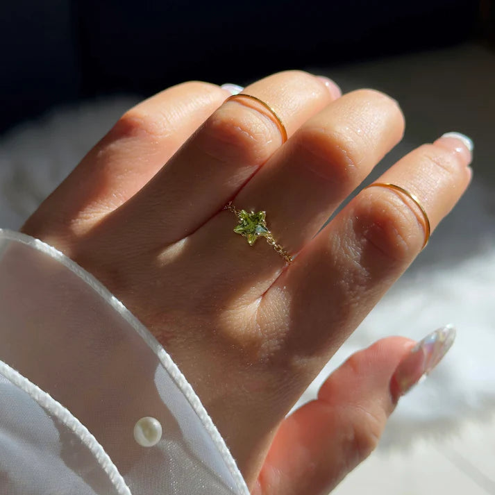 Il Star Chain Ring con Peridot è ispirato alla connessione tra luce, guarigione e autenticità.